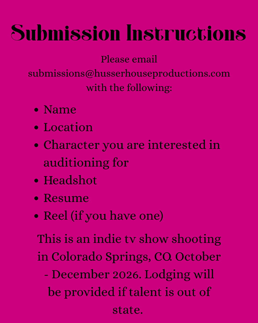 This is an indie tv show shooting in Colorado Springs, CO. October - December 2026. Lodging will be provided if talent is out of state.